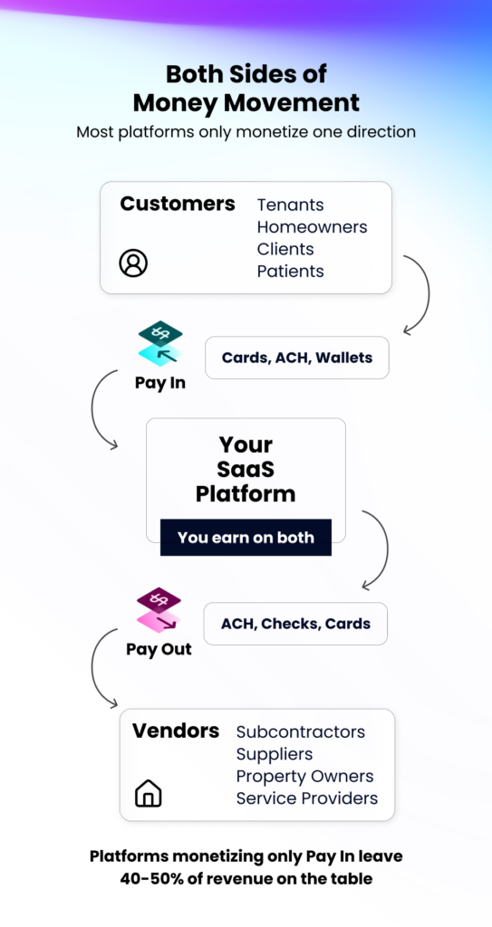 For example, in a construction management platform, a general contractor collects payments from the property owners (Pay In) and then is required to pay plumbers, electricians, and other suppliers (Pay Out). Similarly, in property management, a platform’s client collects rent from tenants, then pays utility companies, maintenance vendors, and property owners. The platforms that only monetize one side of payments are leaving potential revenue on the table, as both sides of the payment carry a margin.